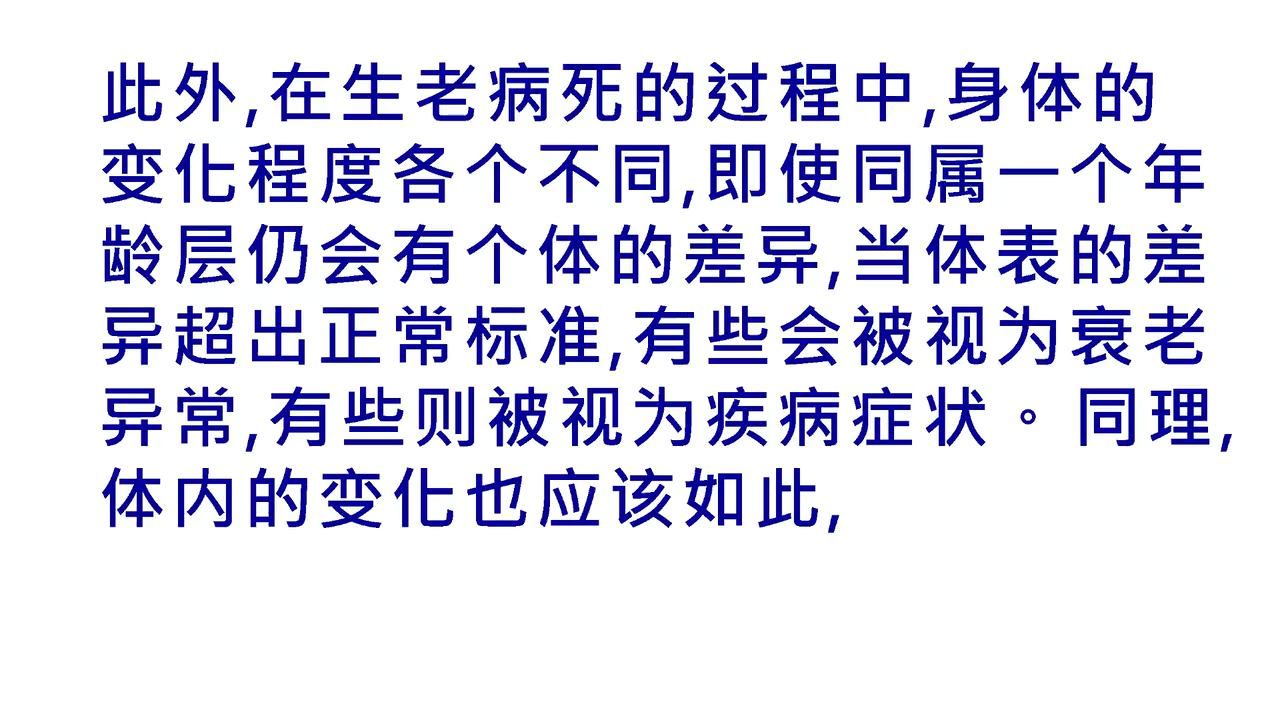 好,我们来看这一段,这一段进一步从生老病死的过程中来探讨这个异常。因为一个人的身体变化程度每个人都不一样,即便是同一个年龄,那表现出来也会差异蛮大。而这些体表如果它的差异超出正常标准,那有些就会被认为可能就是衰老的异常,或被认为是疾病症状。只有这两种可能,因为你身体不可能越变越年轻,所以不是变老就是变病。