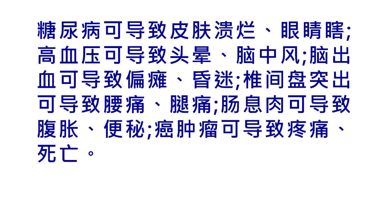 椎间盘突出会导致腰痛、腿痛,前面已经讲过,也是果生果的问题。一个果可以生出很多疾病来,用这样来迷惑,所以患者可能就要吃药控制疼痛,甚至还要严重一点。椎间盘突出还要开刀,这个都都变成本来没什么大问题的,会搞到很严重。