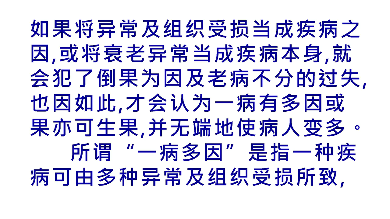 如果将异常及组织受损当成疾病之一,或将衰老、异常当成疾病本身,就会犯了倒果为因及老病不分的过失。也因如此,才会认为疾病有多因,或果亦可生果,并无端地使病人变多。