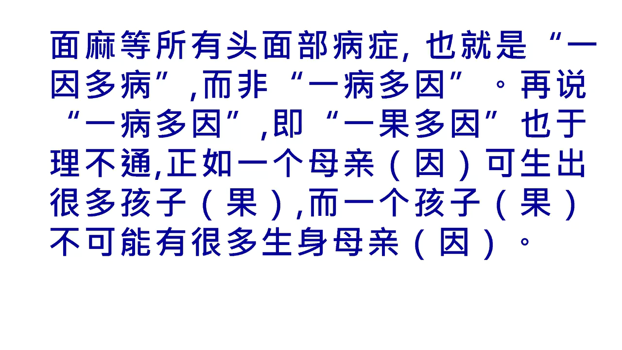 一个是一因一个疾病基因可以产生很多种疾病,恰恰跟西医的一个病是由很多检查出来的因所导致,这完全是不通的。那我们这里就再进一步论述,如果说一个病有那么多因,也就是好像一个病是果,那一个果就有很多因来产生,那这个理论上是说不通的,我们这里就举,比如说母亲如果是因的话,她可以生出孩子,很多孩子果,一个母亲可以生出很多果,但一个孩子果,一个孩子而已,他不可能有很多母亲一起来生他的,这个不可能。所以西医,从因果的角度来看,根本就是说不通的,所以他们的一病多因本身就是有问题的。好,我们继续看下一页。