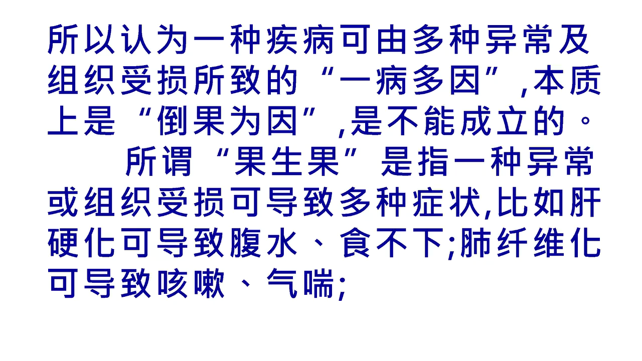 所以认为一种疾病可由多种异常及组织受损所导致的一病多因,本质上是犯了什么呢?倒果为因,所以它是不能成立的那也就是说这一段就是当你生病的时候,西医会要求你检查,你检查出来不管是异常或组织受损,他就会说这个是你的因。那这样会产生怎么样患者的恐慌,那恐慌了之后患者要不要治疗,这个就面临到患者的抉择。有时候患者一听到西医这么讲,大部分都六神无主了,他慌不择路了,所以就任由西医宰割了,就会有这种问题出来。