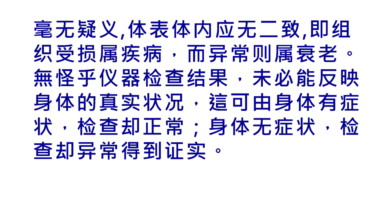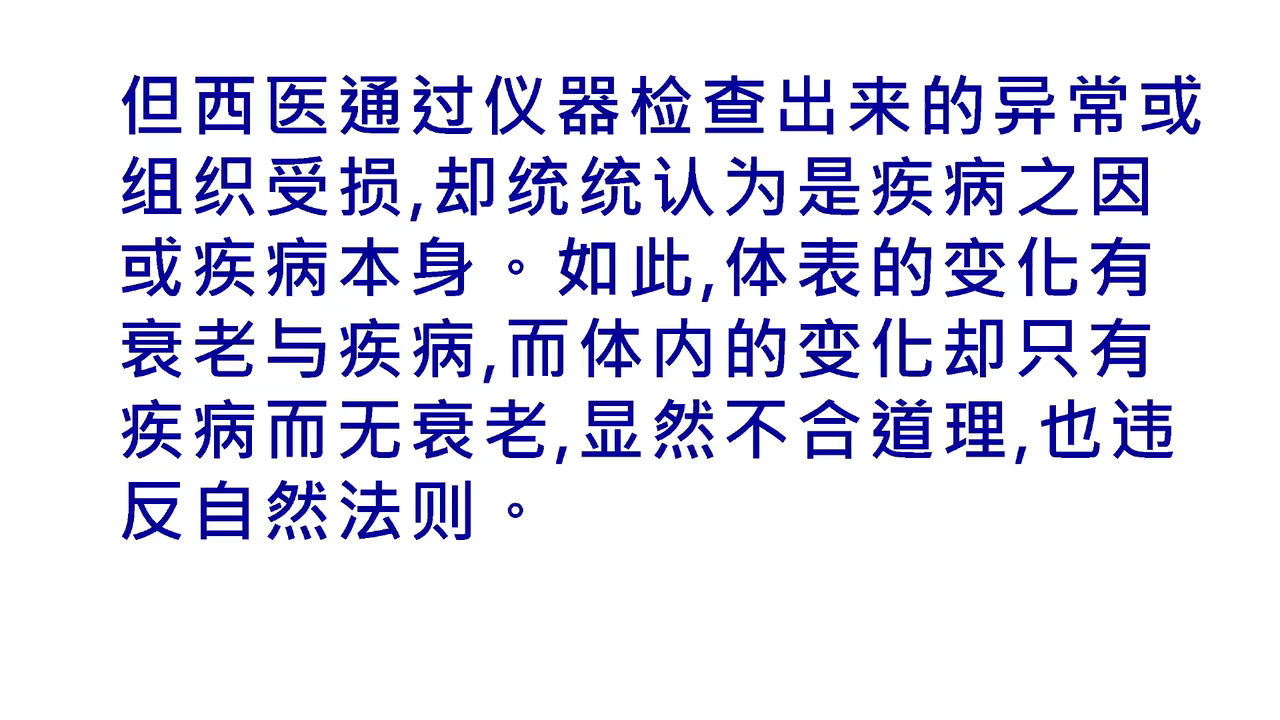 体表我们是可以这样观察出来,这个很容易理解。那体内照理应该是这样,你一个身体体表会变老,会变病,那体内会不会变老会变病?一样的,这个不应该分的。但问题就出在这里,因为体内我们非肉眼可见,我就必须要依赖仪器来检查。那问题仪器检查出来就由西医来认定,他们的认定有时候又会很荒谬。我们来看下面下一页,他检查出来不管是异常或组织受损,都把它认为是疾病之一或疾病本身。这样就跟体表不一样,体表有衰老有疾病,但体内怎么都是疾病呢?显然体内的变化只有疾病而无衰老,这个跟我们的身体的自然规则是不合乎的,已经违反了所以它是不合道理的,很明显是这样,所以这里就特别提出来,这个是说不通的,所以毫无意义。