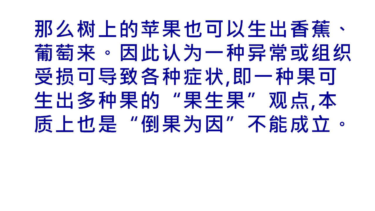 所谓“果生果”是指一种异常或组织受损可导致多种症状,比如肝硬化可导致腹水、食不下;肺纤维化可导致咳嗽、气喘; 糖尿病可导致皮肤溃烂、眼睛瞎;高血压可导致头晕、脑中风; 脑出血可导致偏瘫、昏迷;椎间盘突出可导致腰痛、腿痛;肠息肉可导致腹胀、便秘;癌肿瘤可导致疼痛、死亡。但检查出来的异常及组织受损与身体的症状皆属果,其间并无因果关系,这道理就像症(痛)不生状(肿),状(肿)不生症(痛)一样。再者, 异常属衰老,症状属疾病,要是不一样的果都可以果生果的话, 那么树上的苹果也可以生出香蕉、葡萄来。因此认为一种异常或组织受损可导致各种症状,即一种果可生出多种果的“果生果” 观点,本质上也是“倒果为因”不能成立。