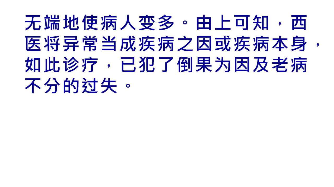 好,另外反过来说,患者没有症状,好好的一个人让他去检查,却不幸检查出有异常。那这时候因为患者没有症状,他不能再说这个异常就是症状之一。因为患者没有症状,你哪来的什么因呢?这时候西医又会改口,他会说你这个检查出来的异常就是疾病本身就是要治疗。反正你不管患者有病无病,只要被检查出来,他就有一套说辞叫你治疗好。那这时候患者。被检查出有异常的话,那问题来了,这个异常它是属衰老,既非症也非状,属衰老。那你处理异常会怎么样?医疗是要处理疾病的,那你处理异常就会怎么样,超出医疗治病的范畴。你根本不是在治病,你是在治老,但是你又把病人轰的,就是说是你是在治病。这个跟治病无关的,异常是衰老,这个是很显然是犯了错误的。好,我们看下面,这样的结果就是我刚刚讲,会导致怎么样,病人越来越多,你所有检查出来的异常都是,不是疾病之因,就是疾病本身都要治疗,那难怪你永远治不完。所有的病人越来越多,造成医护人员的负担,患者每次去医院都是不快乐的,所以这个是一个很重大的问题。所以由上可知,西医将异常的不管是当成疾病之因,或把它当成疾病本身,这样的诊断跟治疗,已犯了怎么样还是一样的问题。倒果为因,还有一个什么老病不分。那这个两个问题,老病不分会造成患者越来越多,倒果为因会让患者检查出来会恐慌,恐慌西医又会说果会生,果然后来吓唬患者,然后患者就不得不治疗,所以这些都造成医院越来病人越多,治不完的病,这个是确实是现代医学最大的问题,这个我们也已经都看得出来了。