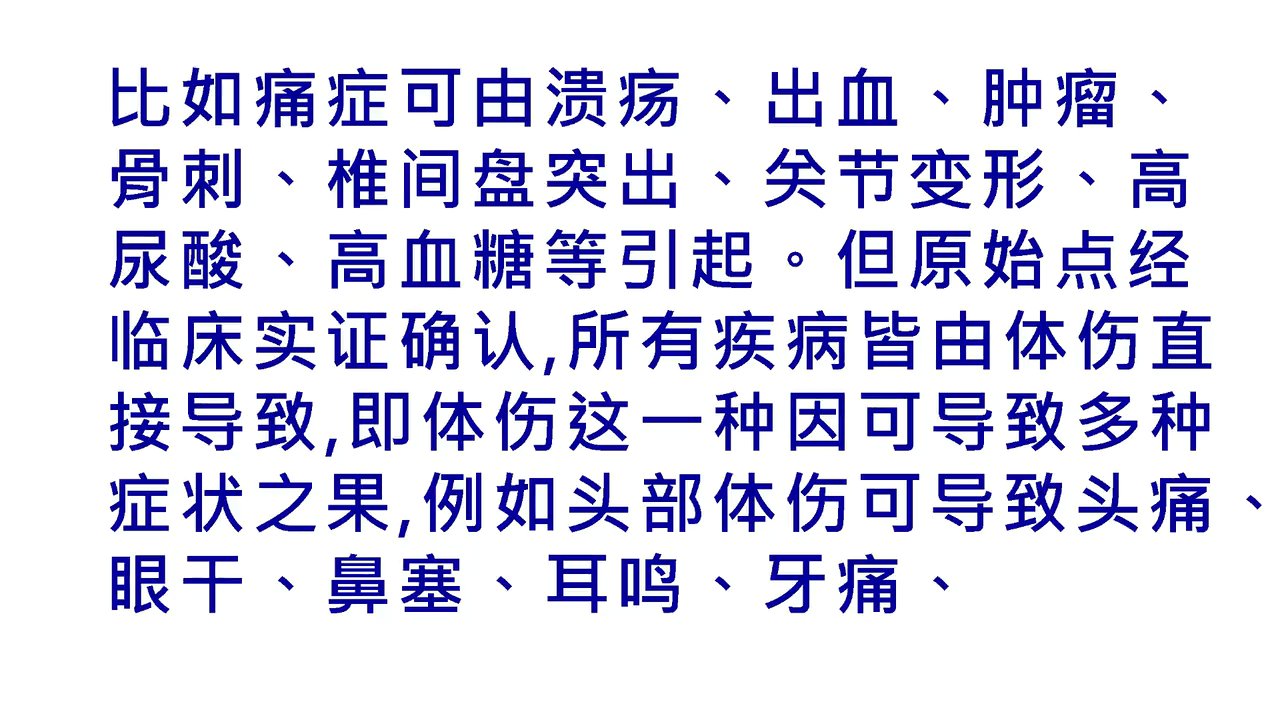 所谓“一病多因”是指一种疾病可由多种异常及组织受损所致,比如痛症可由溃疡、出血、肿瘤、骨刺、椎间盘突出、关节变形、高尿酸、高血糖等引起。但原始点经临床实证确认,所有疾病皆由体伤直接导致,即体伤这一种因可导致多种症状之果, 例如头部体伤可导致头痛、眼干、鼻塞、耳鸣、牙痛、面麻等所有头面部病症,也就是“一因多病”,而非“一病多因”。再说“一病多因”,即“一果多因”也于理不通,正如一个母亲(因) 可生出很多孩子(果),而一个孩子(果)不可能有很多生身母亲(因)。所以认为一种疾病可由多种异常及组织受损所致的“一病多因”,本质上是“倒果为因”,是不能成立的。