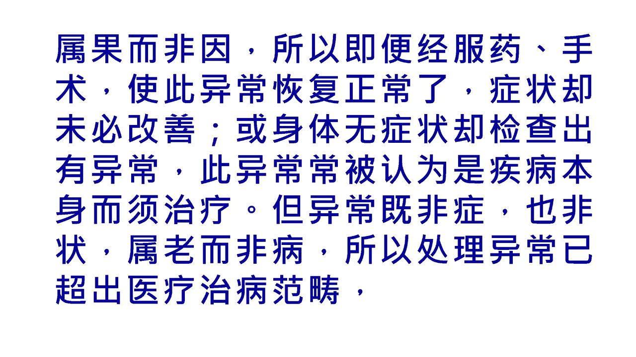 此外在生老病死的过程中,身体的变化程度各个不同,即使同属一个年龄层,仍会有个体的差异。当体表的差异超出正常标准,有些会被视为衰老异常,有些则被视为疾病症状。同理,体内的变化也应该如此。但西医通过仪器检查出来的异常或组织受损,却通通认为是疾病之因或疾病本身。如此,体表的变化有衰老与疾病,而体内的变化却只有疾病而无衰老,显然不合道理,也违反自然法则。毫无疑义,体表、体内应无二致,即组织受损属疾病,而异常则属衰老。