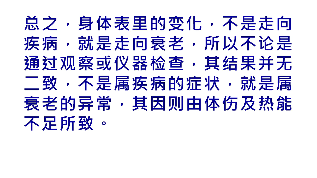 - 总之,身体表里的变化,不是走向疾病,就是走向衰老,所以不论是通过观察或仪器检查,其结果并无二致,不是属疾病的症状,就是属衰老的异常,其因则由体伤及热能不足所致。