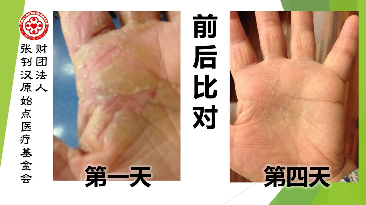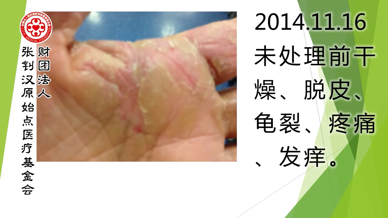 未处理前干燥、脱皮、龟裂、疼痛、发痒愈合,厚皮稍有变软。