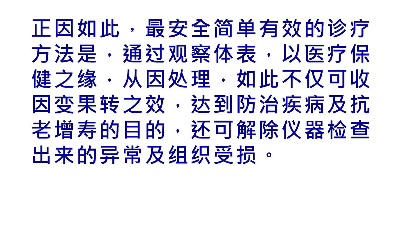 正因如此,最安全简单有效的诊疗方法是,通过观察体表,以医疗保健之缘,从因处理,如此不仅可收因变果转之效,达到防治疾病及抗老增寿的目的,还可解除仪器检查出来的异常及组织受损。