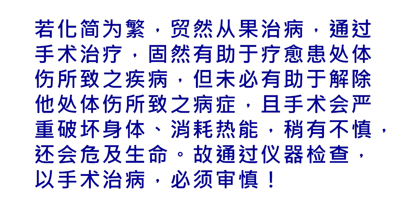 - 若化简为繁,贸然从果治病,通过手术治疗,固然有助于疗愈患处体伤所致之疾病,但未必有助于解除他处体伤所致之病症,且手术会严重破坏身体、消耗热能,稍有不慎,还会危及生命。故通过仪器检查,以手术治病,必须审慎!