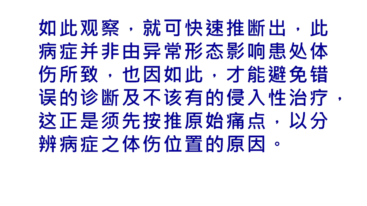 - **临床治疗的优先顺序**:先通过按推原始痛点(及患处痛点)分辨病症位置,若按推无效,才考虑西医从果入手的治疗方法。避免不必要的手术或过度治疗。