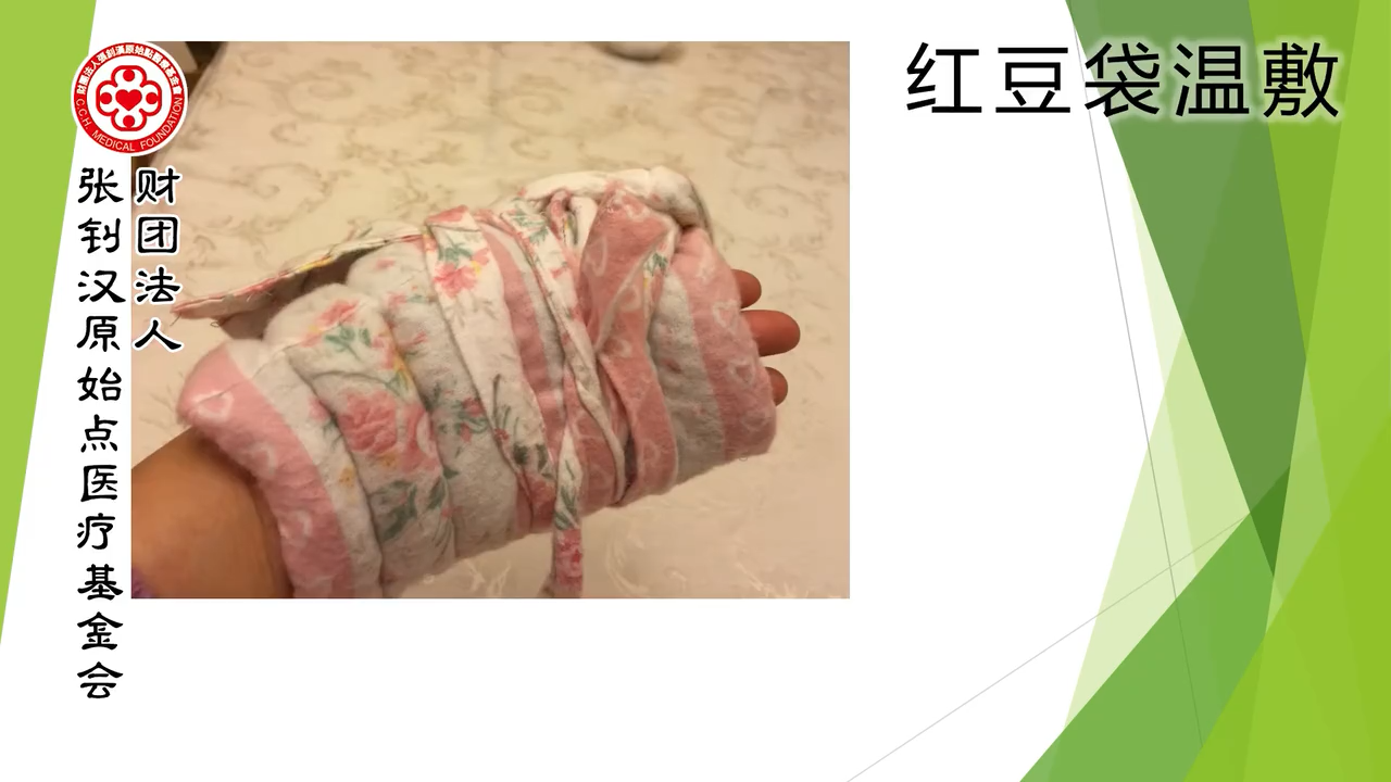 2014年11月16号用红豆袋绑在手上温敷,只温敷一天就看到效果,但手上绑住红豆袋容易脱落不方便,于是改用脖围加暖暖贴24小时温敷,前后三天明显改善。