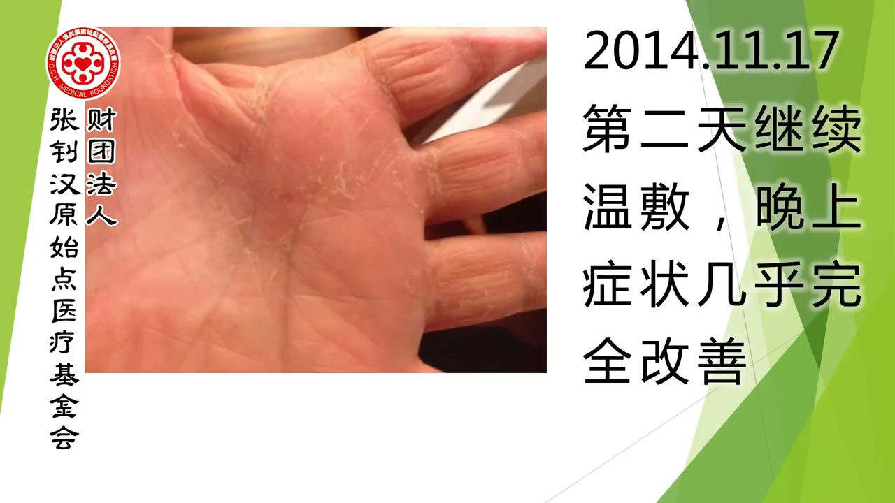 阿明,25岁,住美国沙加缅度,2014年12月2号前胸开始出现红斑和水泡,一群一群长在一起,看起来像一串珠,又像一条蛇,肿痛传到后背,经医生诊断为:生蛇(带状疱疹)!告知必须要吃药打针并要家人打预防针避免感染!母亲并让他服用白花蛇草来清热解毒,结果红疹部位更痒更痛像火烧一样,经人介绍到当地推广点用原始点方法,先温敷一小时,再按推头部及背部,再继续温敷一小时。喝姜水约200CC,嘱咐回家暂不喝饮料开水,避免吃寒凉食物,要求做到24小时温敷!仅仅两天就明显改善,胸及背部带状疱疹明显消退不再肿痛。