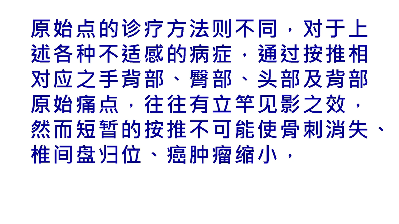 原始点的诊疗方法则不同,对于上述各种不适感的病症,通过按推相对应之手背部、臀部、头部及背部原始痛点,往往有立竿见影之效,然而短暂的按推不可能使骨刺消失、椎间盘归位、癌肿瘤缩小,如此观察,就可快速推断出,此病症并非由异常形态影响患处体伤所致,也因如此,才能避免错误的诊断及不该有的侵入性治疗,这正是须先按推原始痛点,以分辨病症之体伤位置的原因。
