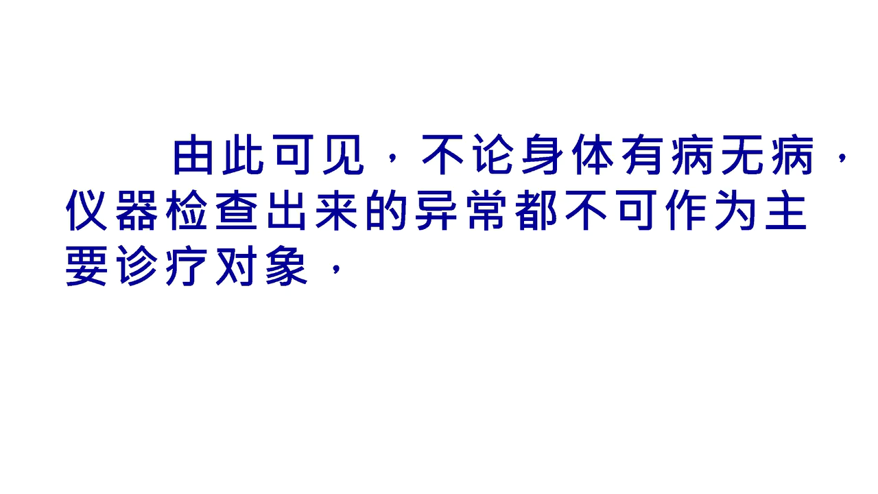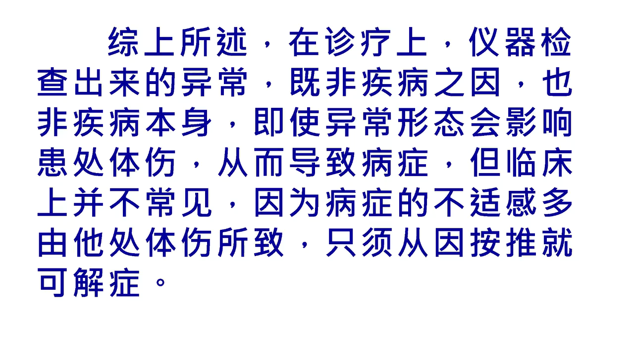 - 综上所述,在诊疗上,仪器检查出来的异常,既非疾病之因,也非疾病本身,即使异常形态会影响患处体伤,从而导致病症,但临床上并不常见,因为病症的不适感多由他处体伤所致,只须从因按推就可解症。