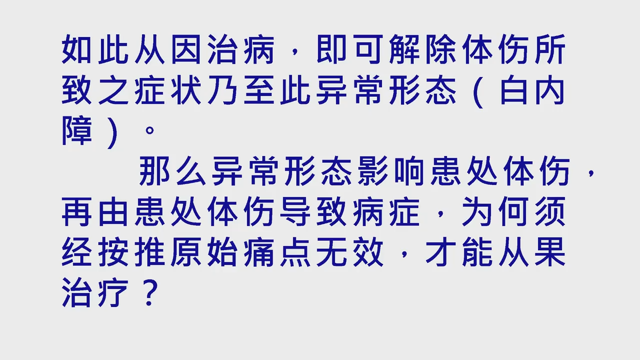 - 明了此理,原始点只须通过观察或按推,以分辨疾病之体伤位置,再用按推与热源从体伤位置下手,如此从因治病,即可解除体伤所致之症状乃至此异常形态(白内障)。那么异常形态影响患处体伤,再由患处体伤导致病症,为何须经按推原始痛点无效,才能从果治疗?