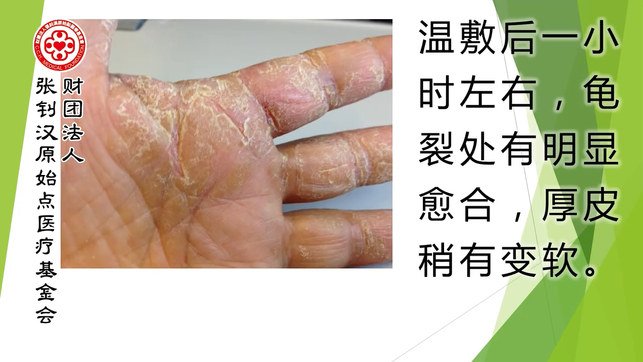 红豆袋温敷温敷约3小时,龟裂处几乎愈合,硬皮变软