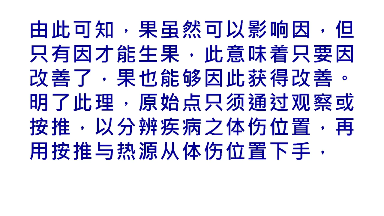 明了此理,原始点只须通过观察或按推,以分辨疾病之体伤位置,再用按推与热源从体伤位置下手,如此从因治病,即可解除体伤所致之症状乃至此异常形态(白内障)。那么异常形态影响患处体伤,再由患处体伤导致病症,为何须经按推原始痛点无效,才能从果治疗?