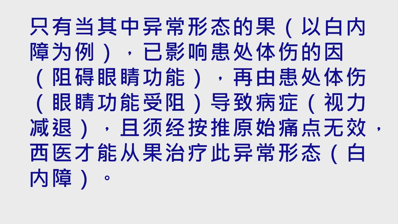 - 由此可见,不论身体有病无病,仪器检查出来的异常都不可作为主要诊疗对象,只有当其中异常形态的果(以白内障为例),已影响患处体伤的因(阻碍眼睛功能),再由患处体伤(眼睛功能受阻)导致病症(视力减退),且须经按推原始痛点无效,西医才能从果治疗此异常形态(白内障)。