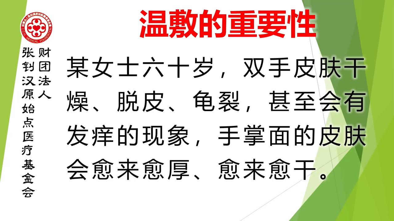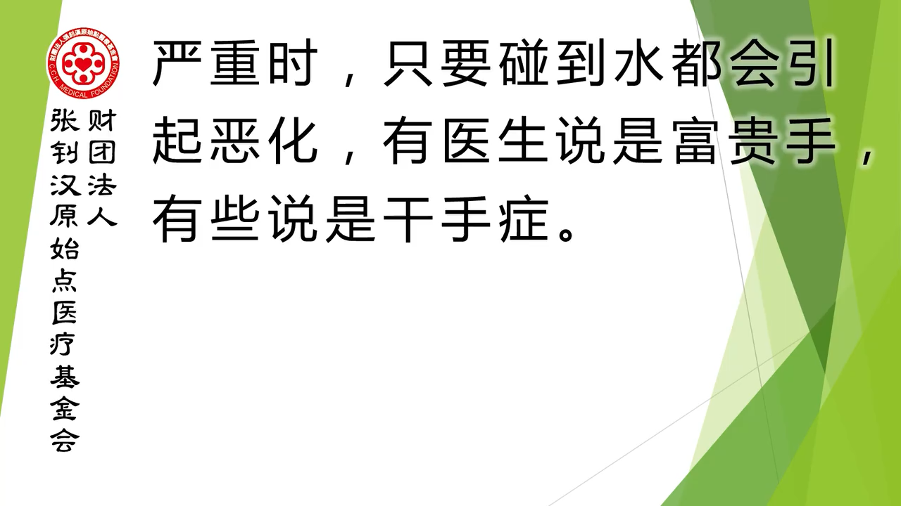 某女士60岁,双手皮肤干燥、脱皮、龟裂甚至会有发痒的现象,手掌面的皮肤会愈来愈厚、愈来愈干,严重时,只要碰到水都会引起恶化,有医生说是富贵手,有些说是干手症。曾使用各类药膏、护手产品或乳液,让手部维持滋润,远离或少接触容易诱发富贵手的东西,但是都未见改善!