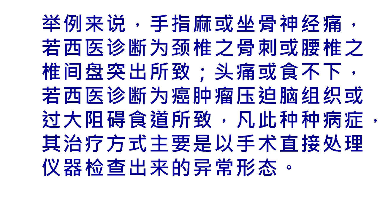 举例来说,手指麻或坐骨神经痛,若西医诊断为颈椎之骨刺或腰椎之椎间盘突出所致;头痛或食不下,若西医诊断为癌肿瘤压迫脑组织或过大阻碍食道所致,凡此种种病症其治疗方式主要是以手术直接处理仪器检查出来的异常形态。