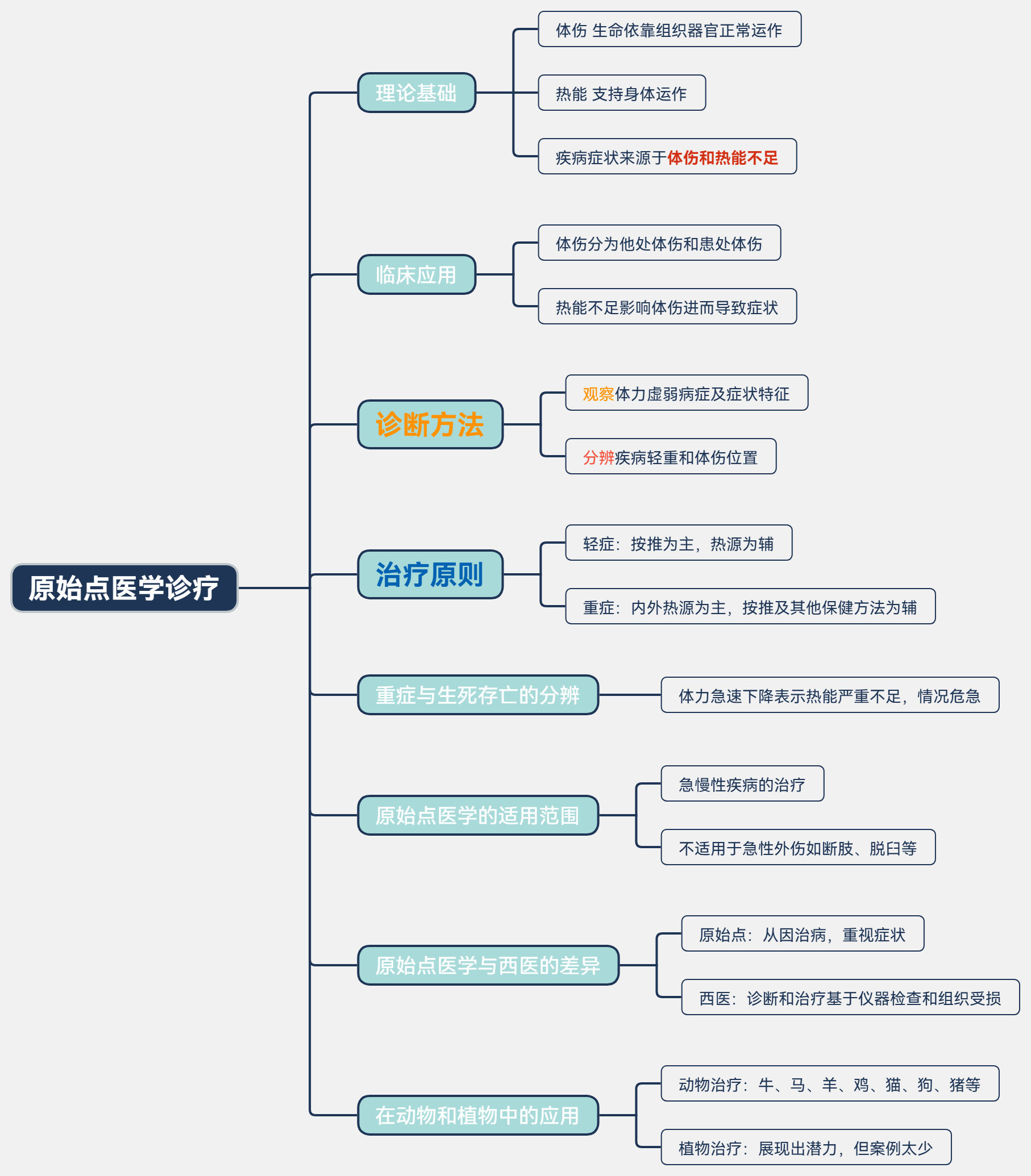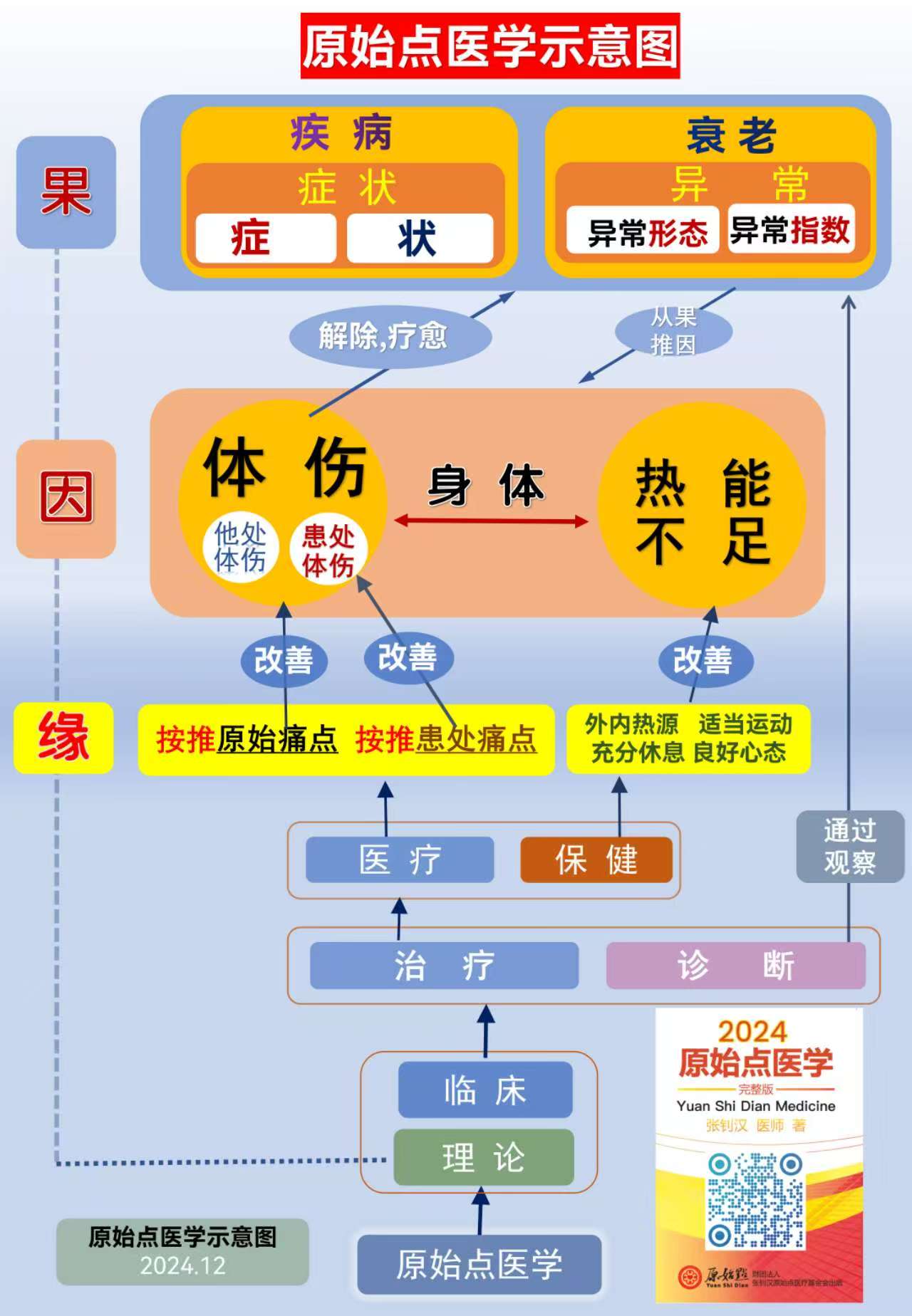医学包括理论与临床,就理论而言,原始点医学认为生命要靠身体的组织器官运作来维持,而推动组织器官正常运作需要充足的能量此能量称为热能。因此所有疾病症状不外乎源自两个层面的问题:一是身体组织器官运作失调状态的体伤问题,二是身体能量不足以供应组织器官正常运作的热能不足问题就临床而言,原始点医学通过按推与热源亦已实证出,所有疾病症状皆因体伤及热能不足所致。