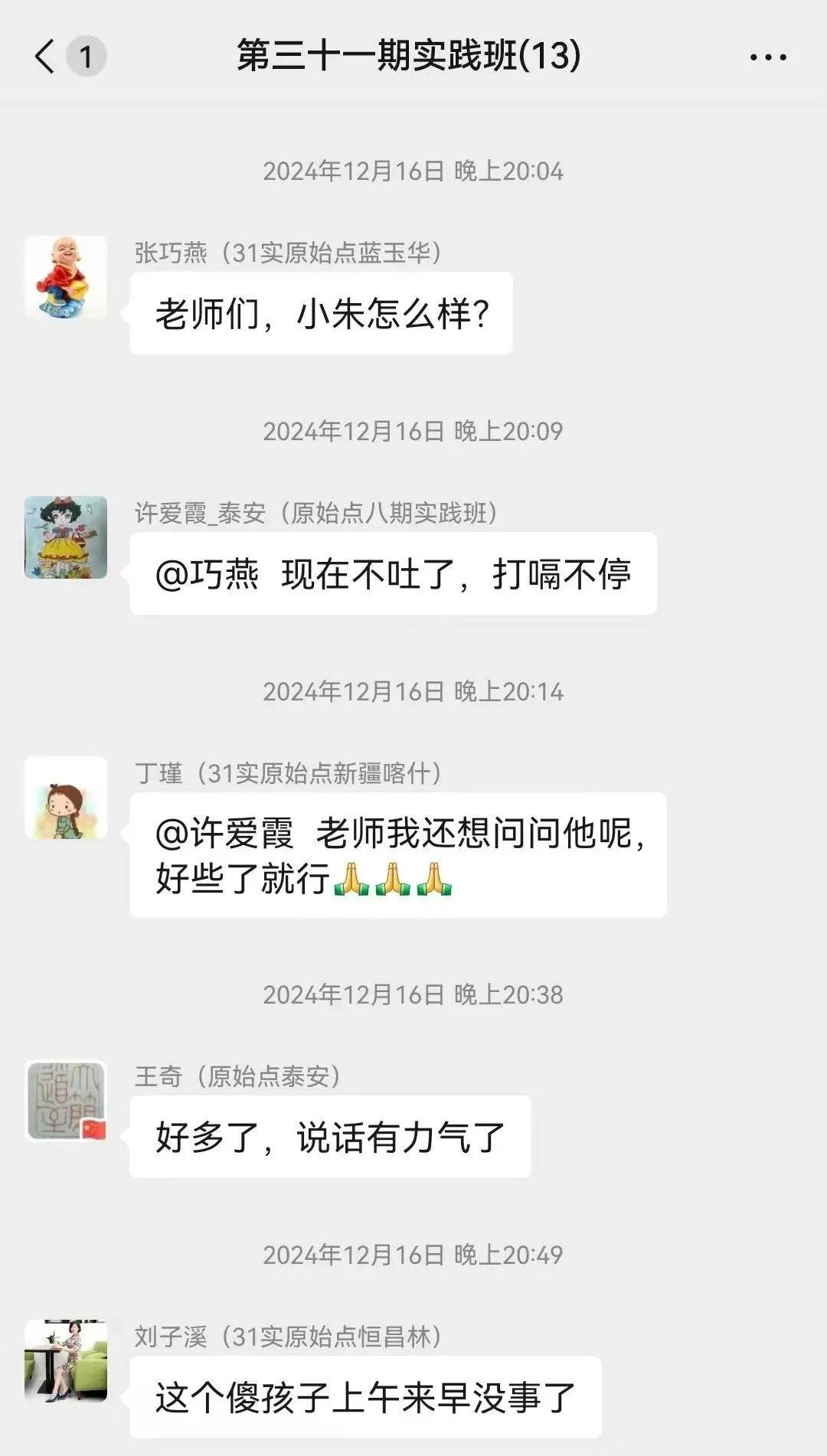 直到下午4点左右自己感觉情况不好,就联系程老师看看能不能接到中心来,程老师安排义工许老师和朱老师开车去接,帮他处理下,当时我们也都以为是吃的不合适造成的,许老师到了后,发现情况非常严重,虚弱的都下不了床,许老师还帮他按推了背部和头部,但没什么改善,俩人也弄不了,程老师又开车去到住处,让义工朱老师背着,程老师和许老师在后面扶着,好不容易背到车上,用车拉到烟台原始点中心,下车是王老师和朱老师俩人架着进屋的,后面还有学员帮忙抬着脚,两条腿根本就不能站,也没法走,抬进屋,放到按推床上,程老师重点把头部上背部按推一下,因一天未进食,许老师熬的小米粥一点一点的喂下去,喝了一碗,又熬参汤,用参汤调姜素喝(怕喝姜粉太刺激又再吐出来),到晚上睡觉前没有再呕吐,头也没有发晕。晚上打开床上的黄土球垫子加热温敷,身上也盖上插电红豆袋,一整晚的温敷着,还特别安排义工王老师晚上睡觉陪床观察。同期学员关心咨询。