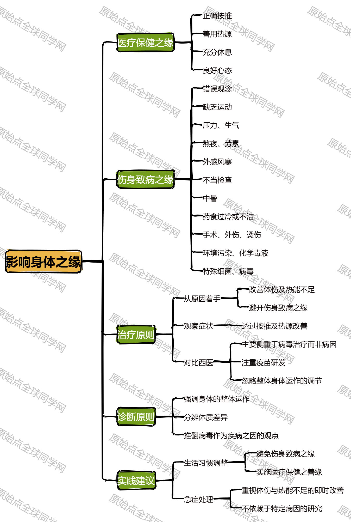 原始点医学认为,身体状态受到医疗保健之缘和伤身致病之缘的影响。医疗保健之缘如正确按推和善用热源等,有助于改善体伤和热能不足。伤身致病之缘如压力、熬夜、不当饮食等,可能直接造成体伤或使热能不足。处理急症时,应善用医疗保健之缘,适度运动和按推,以改善热能不足和体伤。原始点医学强调,任何医疗保健之缘都必须适度,必须在身体能够接受和吸收的范围内,才能达到改善体质乃至疗愈疾病的目的。