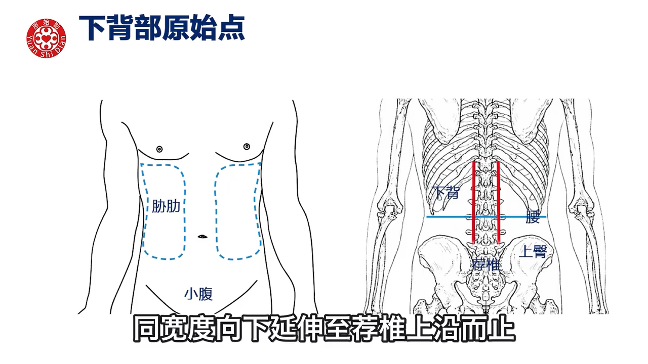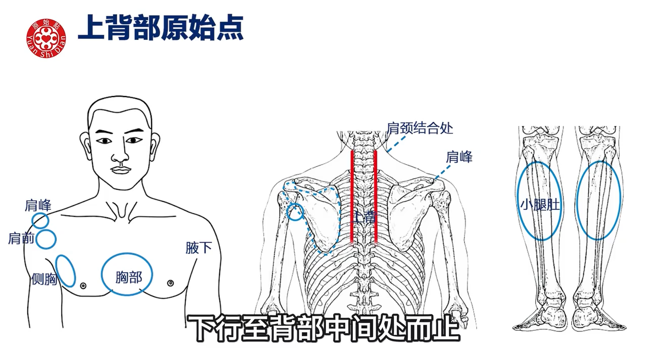 1. **上背部原始点位置**:位于脊椎两侧,左右对称,起于肩颈结合处,下行至背部中间处而止,涵盖范围如图中淡紫色区域所示。