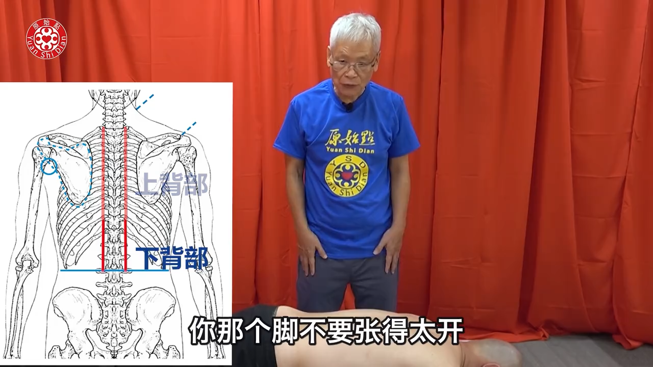 (02:52) 按推方法都一模一样 一样 这个脚就不变了 那这个手稍微往外一点好 那这个身体也是往前 靠过来之後 掌心向上 这是第一点 好 第二点 好 这是第三步 好 以上是上背部 前三点的按推方法 我们现在来示范 脊椎两侧的按推方法 那脊椎两侧当然有分 上背部跟下背部 你那个脚不要张得太开 与肩同宽就好 很多站太开做不出来 这是第一个 然後脚还有一个 就是要好像微微地蹲下来