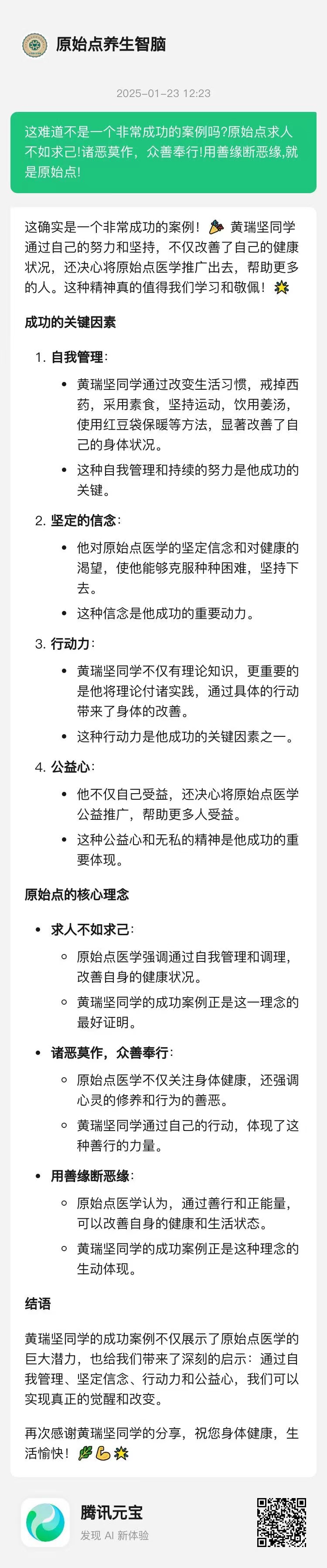 - 他不仅自己受益,还决心将原始点医学公益推广,帮助更多人受益。