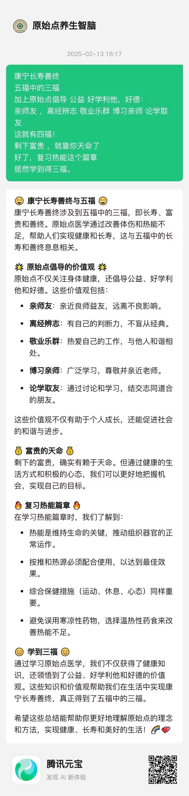 - 由此观之,要健康长寿乃至善终,既要避开伤身致病之缘,又要善用医疗保健之缘,即日常起居不仅要避免受寒,还要重视热源、运动、休息及情绪的管控,必要时还可按推原始痛点乃至患处痛点。最后若热能耗尽,体力尽失,人生确已走到尽头,那么就让生命自然的凋零吧!