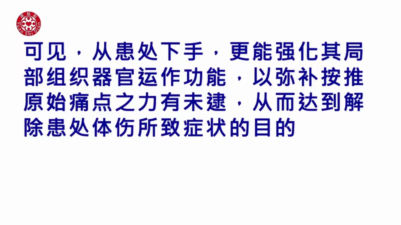 可见,从患处下手,更能强化其局部组织器官运作功能·以弥补按推原始痛点之力有未逮,从而达到解除患处体伤所致症状的目的。