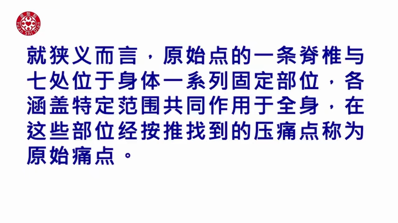 就狭义而言,原始点的一条脊椎与七处位于身体一系列固定部位,各涵盖特定范围共同作用于全身·在这些部位经按推找到的压痛点称为原始痛点。