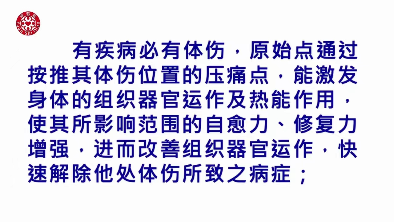 有疾病必有体伤·原始点通过按推其体伤位置的压痛点,能激发身体的组织器官运作及热能作用·使其所影响范围的自愈力、修复力增强,进而改善组织器官运作,快速解除他处体伤所致之病症;