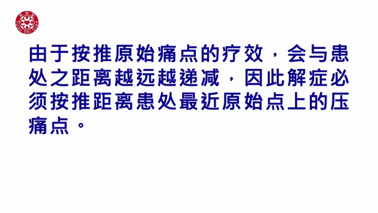 由于按推原始痛点的疗效,会与患处之距离越远越递减,因此解症必须按推距离患处最近原始点上的压痛点。
