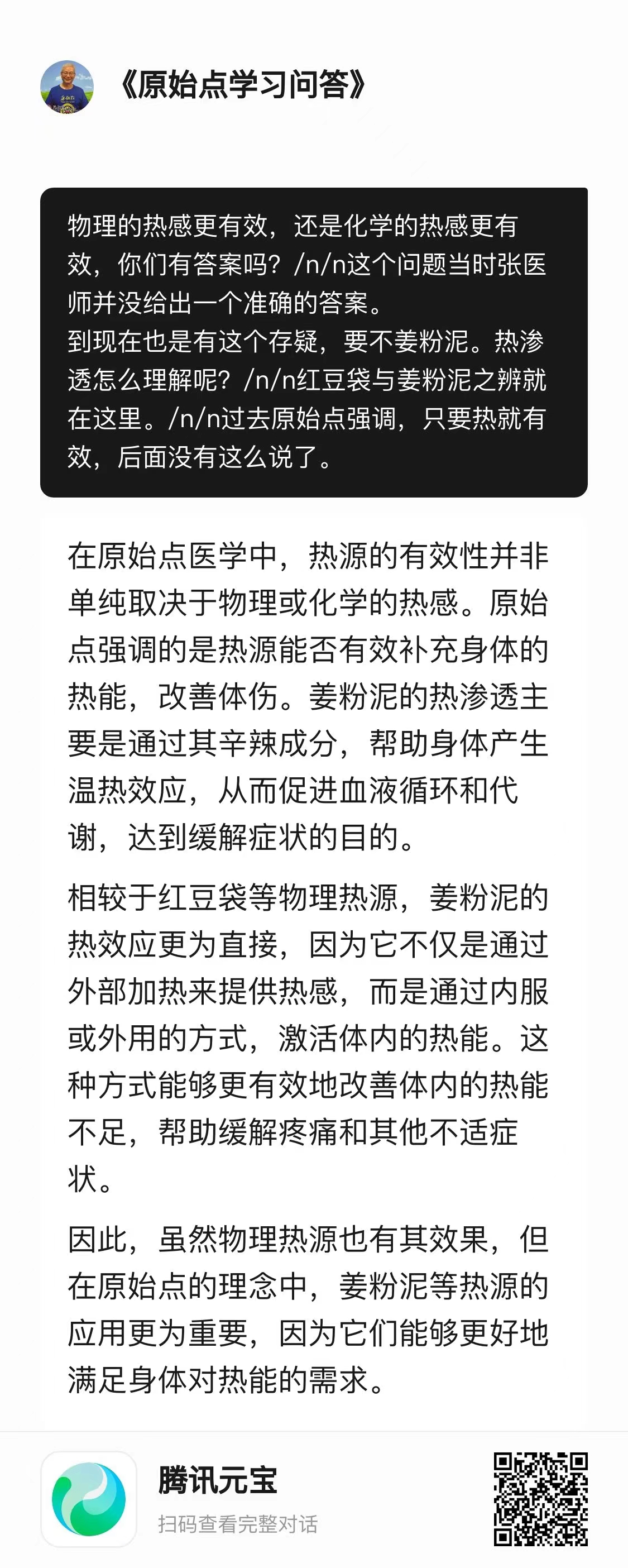 物理的热感更有效,还是化学的热感更有效,你们有答案吗?物理的热感更有效,还是化学的热感更有效,你们有答案吗?这个问题当时张医师并没给出一个准确的答案。 到现在也是有这个存疑,要不姜粉泥。热渗透怎么理解呢?红豆袋与姜粉泥之辨就在这里。过去原始点强调,只要热就有效,后面没有这么说了。