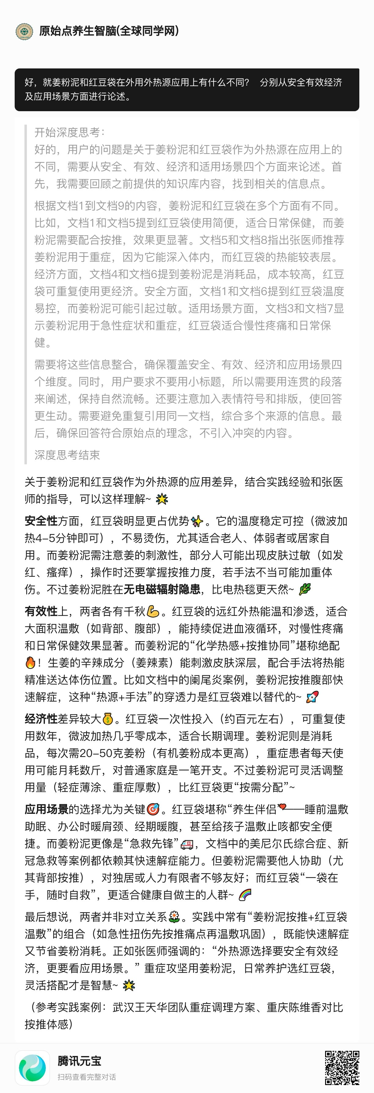最后想说,两者并非对立关系🌼。实践中常有“姜粉泥按推+红豆袋温敷”的组合(如急性扭伤先按推痛点再温敷巩固),既能快速解症又节省姜粉消耗。正如张医师强调的:“外热源选择要安全有效经济,更要看应用场景。” 重症攻坚用姜粉泥,日常养护选红豆袋,灵活搭配才是智慧~ 🌟