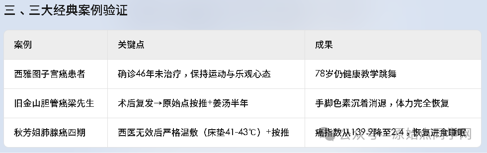 • 三個癌症患者的成功案例,展示原始點療法的有效性。