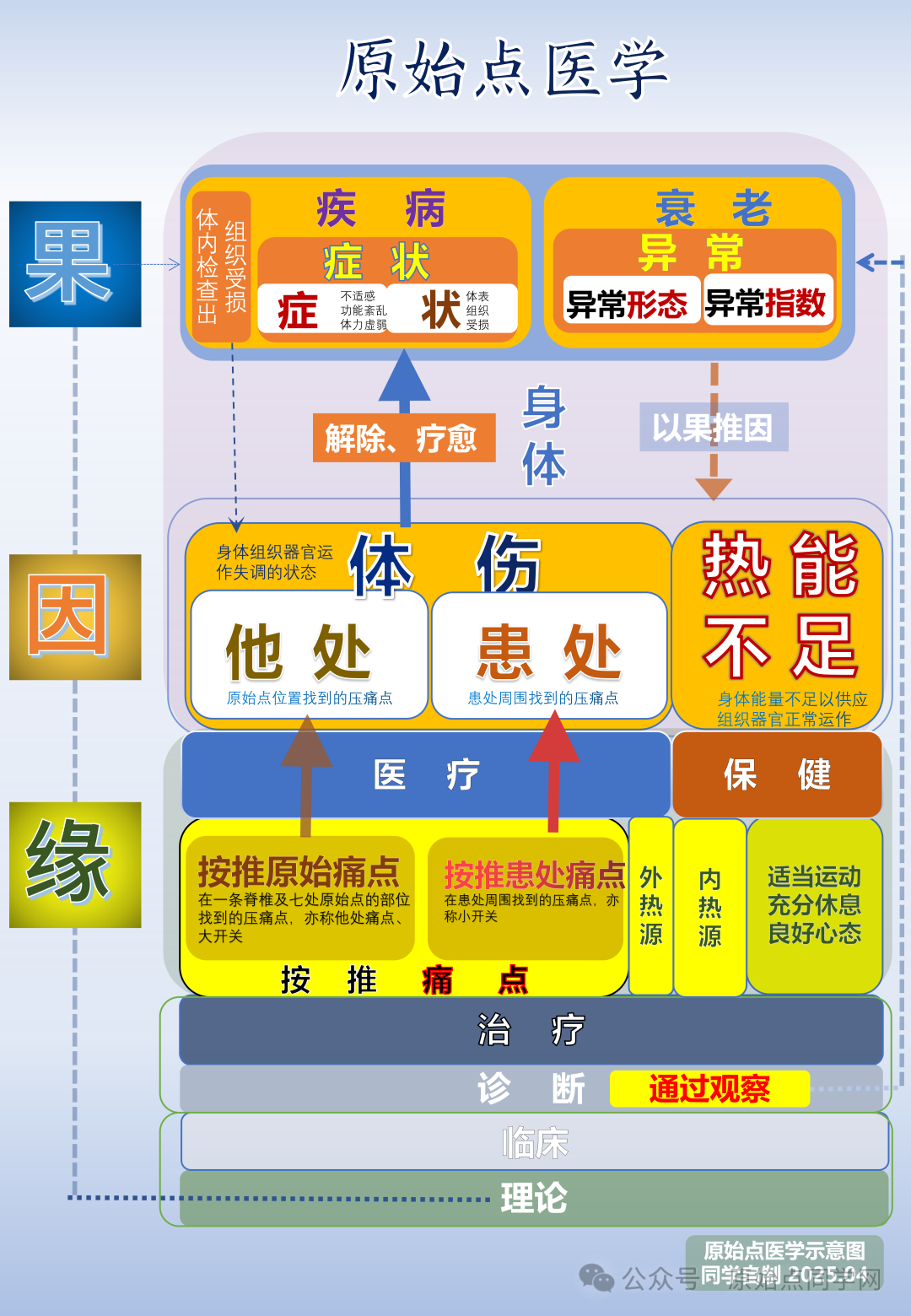 • 正如您所说,**“果”(症状/异常)是身体可见部分**,而**“因”(体伤、热能不足)是内在机制**,二者本质是身体不同层面的表现(文档4:“异常是老非病,由体伤及热能不足所致”)。