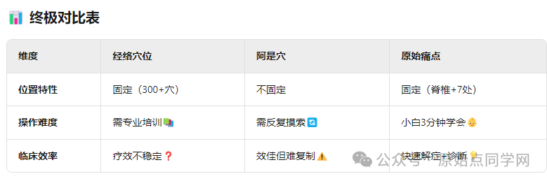 | 对比维度 | 经络穴位 | 阿是穴 | 原始痛点 | 患处痛点 |