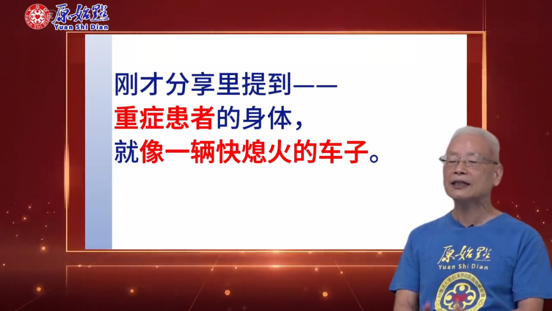 刚才分享里提到,重症患者的身体就像一辆快起火的车子,这时不是修外壳,不是换零件,而是要加油充电,暖机才能重新启动。