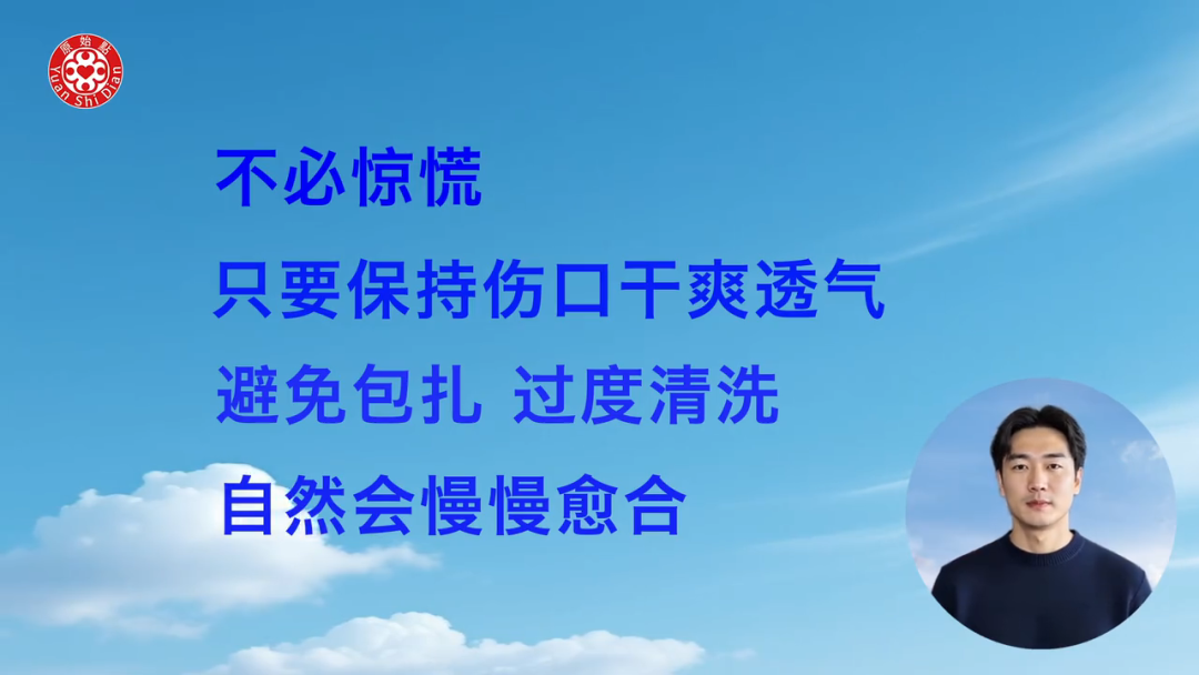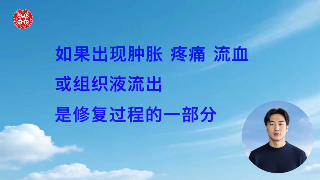 如果出现肿胀、疼痛、流血或组织液流出,是修复过程的一部分,不必惊慌,只要保持伤口干爽透气,避免包扎,过度清洗,自然会慢慢愈合。