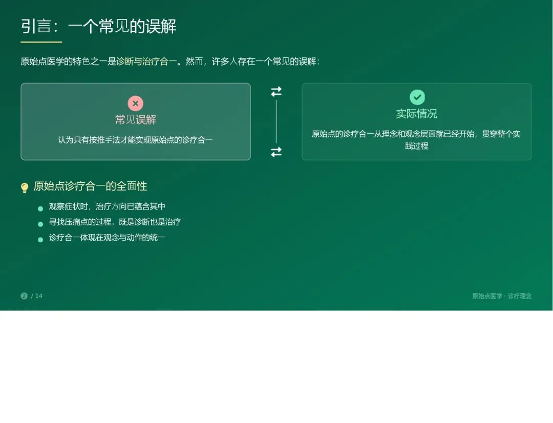 🔍 **诊断与治疗合一**:原始点医学的特色之一是诊断与治疗合一。张医师强调,这种合一不仅体现在按推手法上,还体现在观察症状、诊断疾病和选择治疗方法的整个过程中。