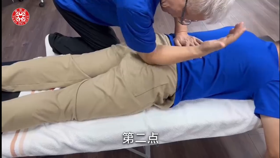 好,这是第一点, 第二点, 第三点。 好,另外对侧也是这样的按法, 工具一样。 这时候身体还要过去一点好,这是第一点, 第二点, 第三点。