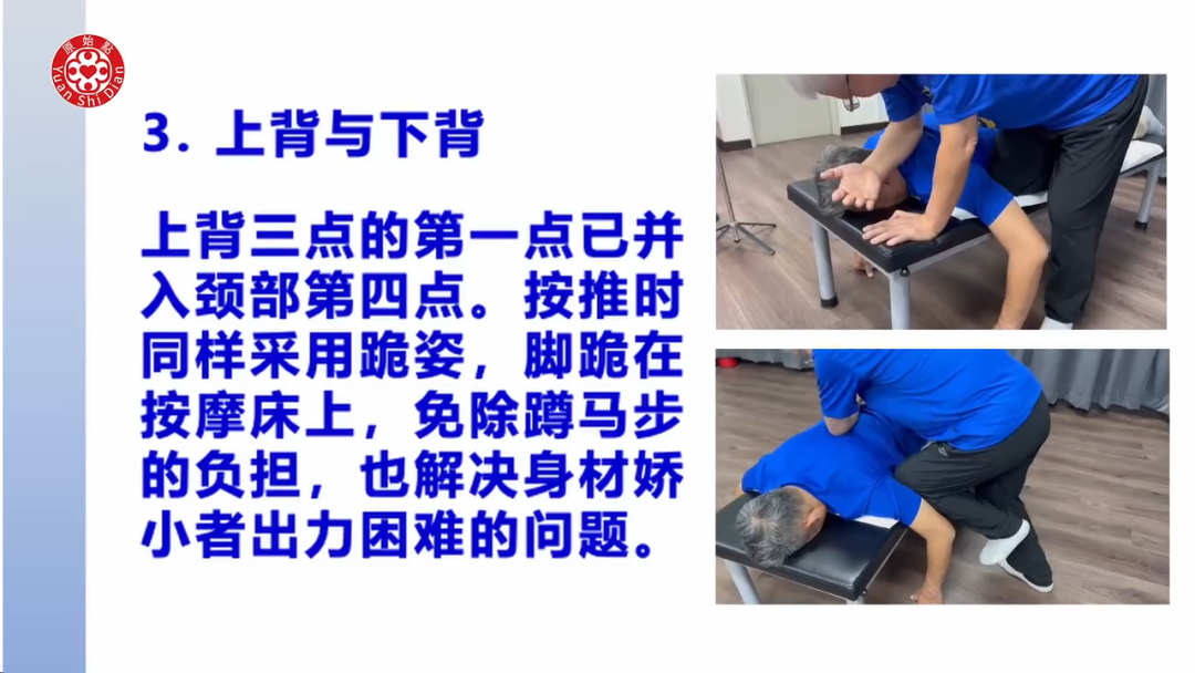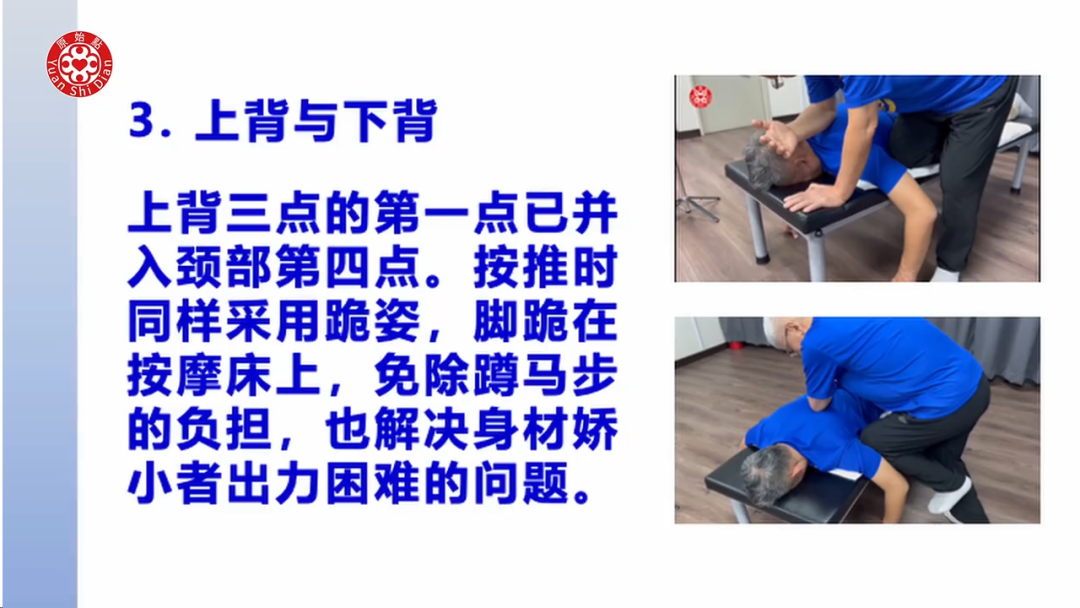第三个是上背部和下背部。上背三点的第一点已变为颈部的第四点,按推时同样采用跪姿脚跪在按摩床上,免除了蹲马步的负担,也解决了身材娇小者处理困难的问题。