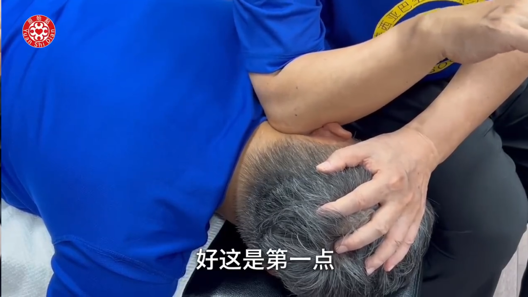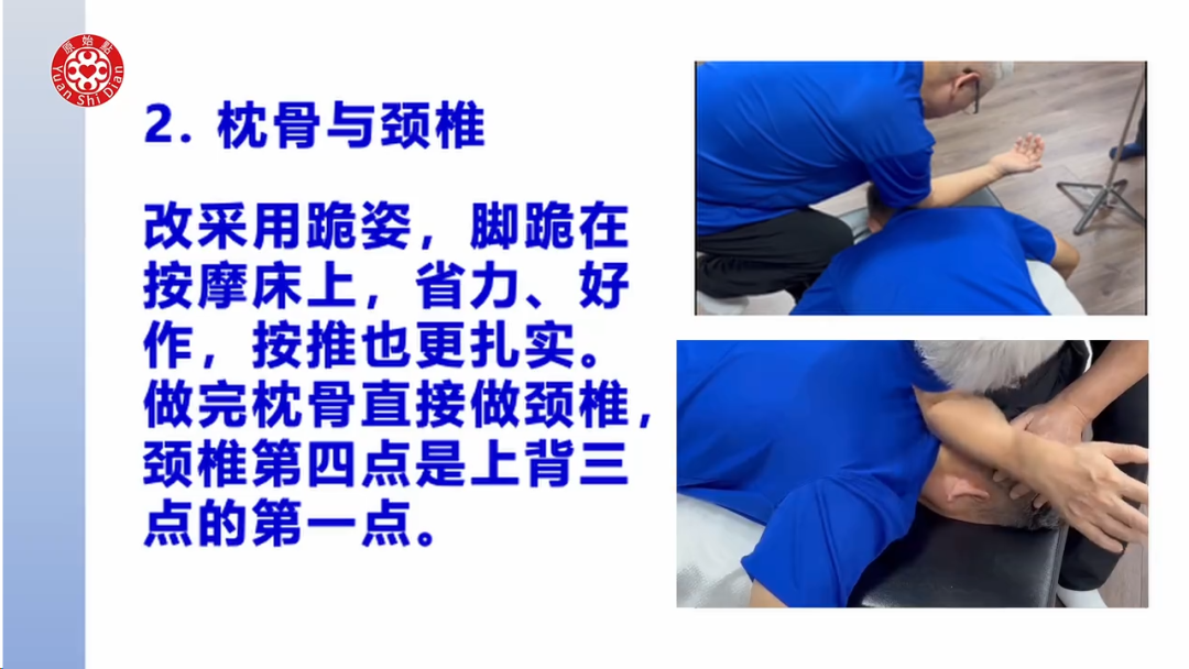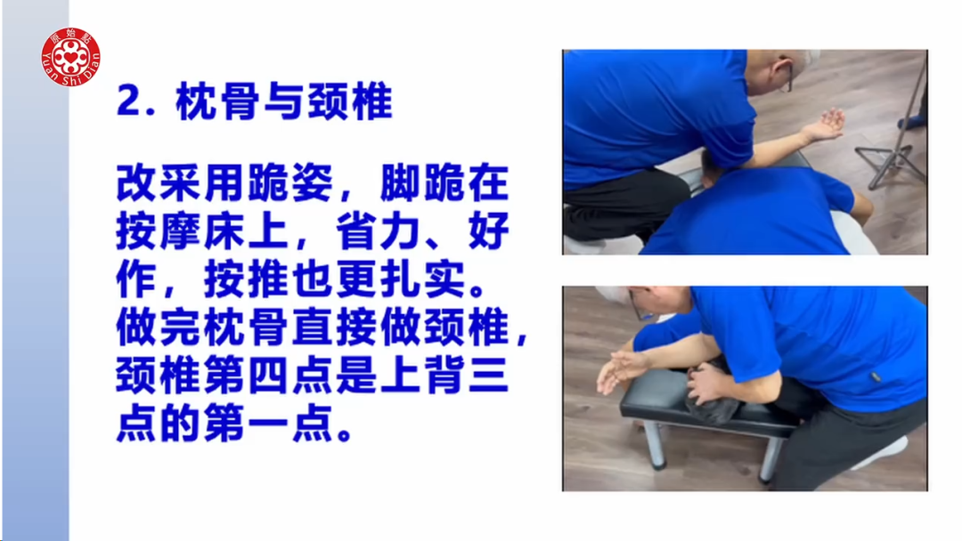第二个是枕骨和颈椎,采用跪姿,脚跪在按摩床上,按枕骨更省力、好操作,按推也更扎实,做完枕骨后直接做颈椎。颈椎的第四点,现在是上背三点的第一点;