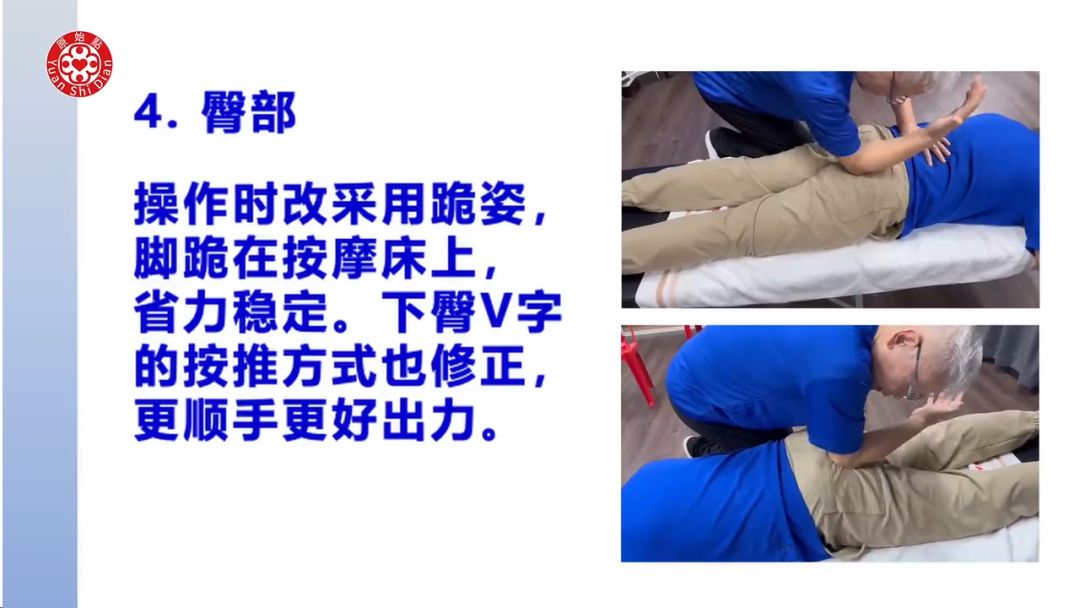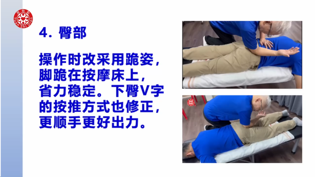 第四个是臀部,操作时改用跪姿脚跪在按摩床上,省力又稳定;下臀的V字型按推也修正得更顺手,更好出力。