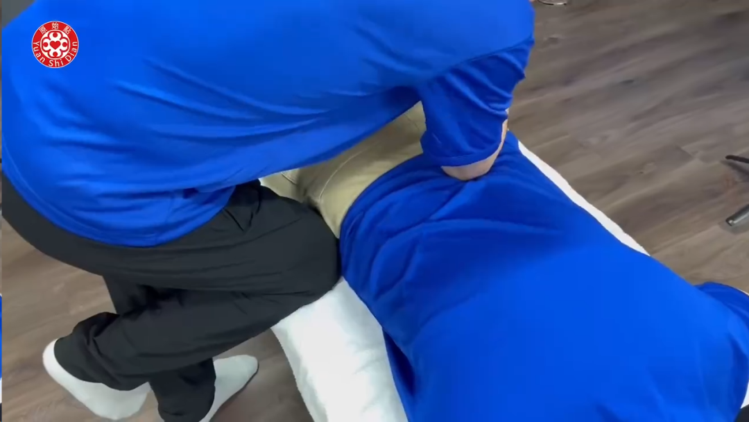 那我们现在来介绍下臀部的按推方法。 下臀部的找法一样你只要这里照我们原来的找法。 这是第一点也就是V字型的第一点。 它从这第一点沿着这里髂骨下沿这样子出去就可以揉到外侧。 那这一点旁边的侧面就是最後一点好。我做给大家看, 一样用右脚跟右手。右脚跪着, 第一点在这里我们可以直接手过来这样扶在床沿。 这里第一点、 第二点、 第三、 第四好。这里最後一点。 那另外还有V字形我们稍微要变化一个方向。 怎麽变化呢? 这跪的地方跪到臀横纹下来。 以前我们屁股也是坐在这个臀横纹。 我们现在用跪姿的也是跪到这里, 然後一手扶着。 然後一样手法跟我们平常按臀部的方法一样, 沿着V字形这样骨盘这样按下来。 第二点、 第三点、 第四点好。这是右侧的按法。