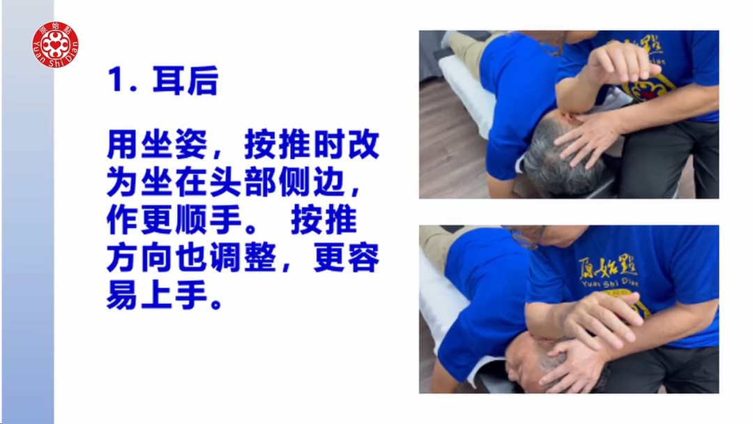 第一个是耳后,现在采用坐姿按推,坐在头的侧边,操作更顺手,按推方向也更容易调整;
